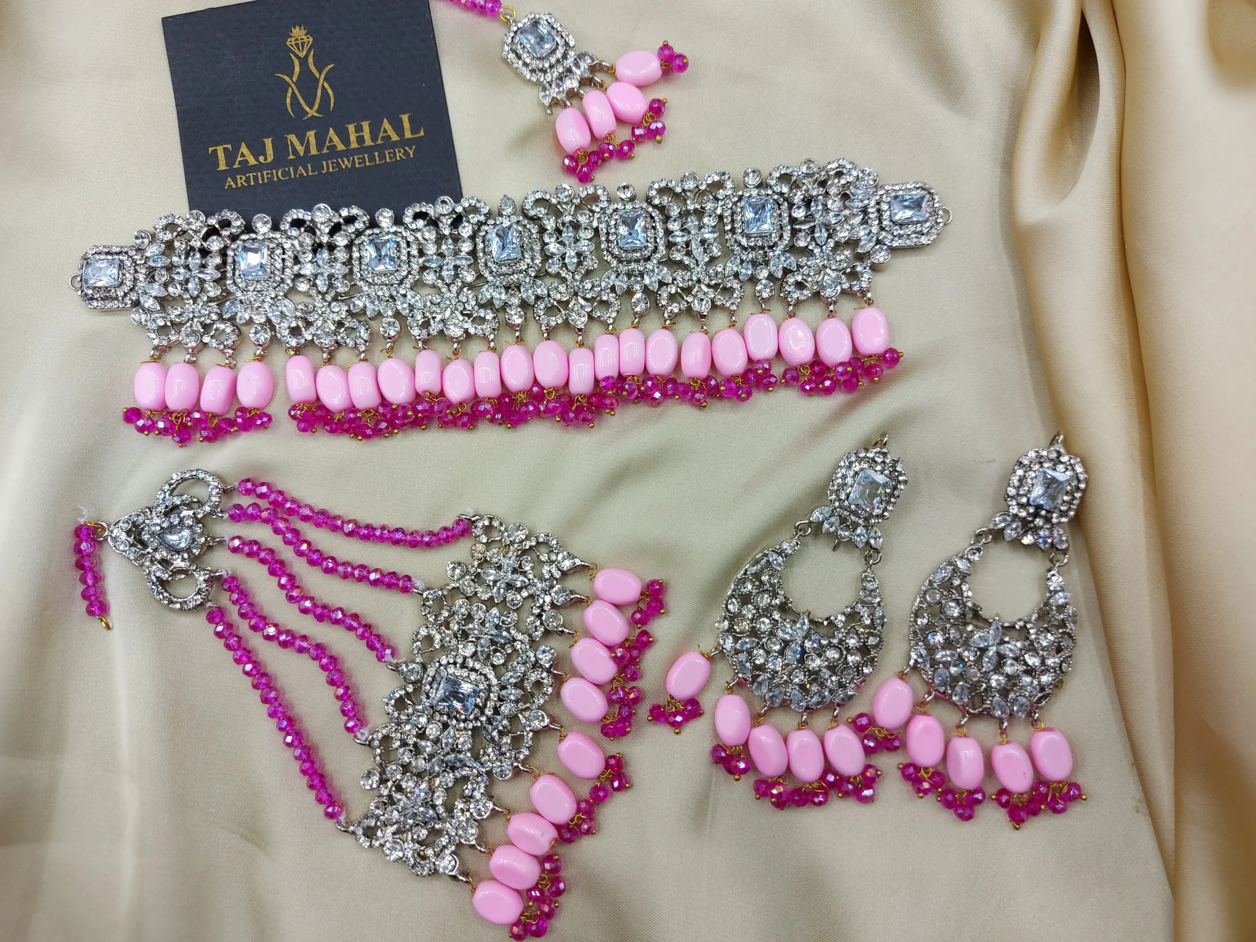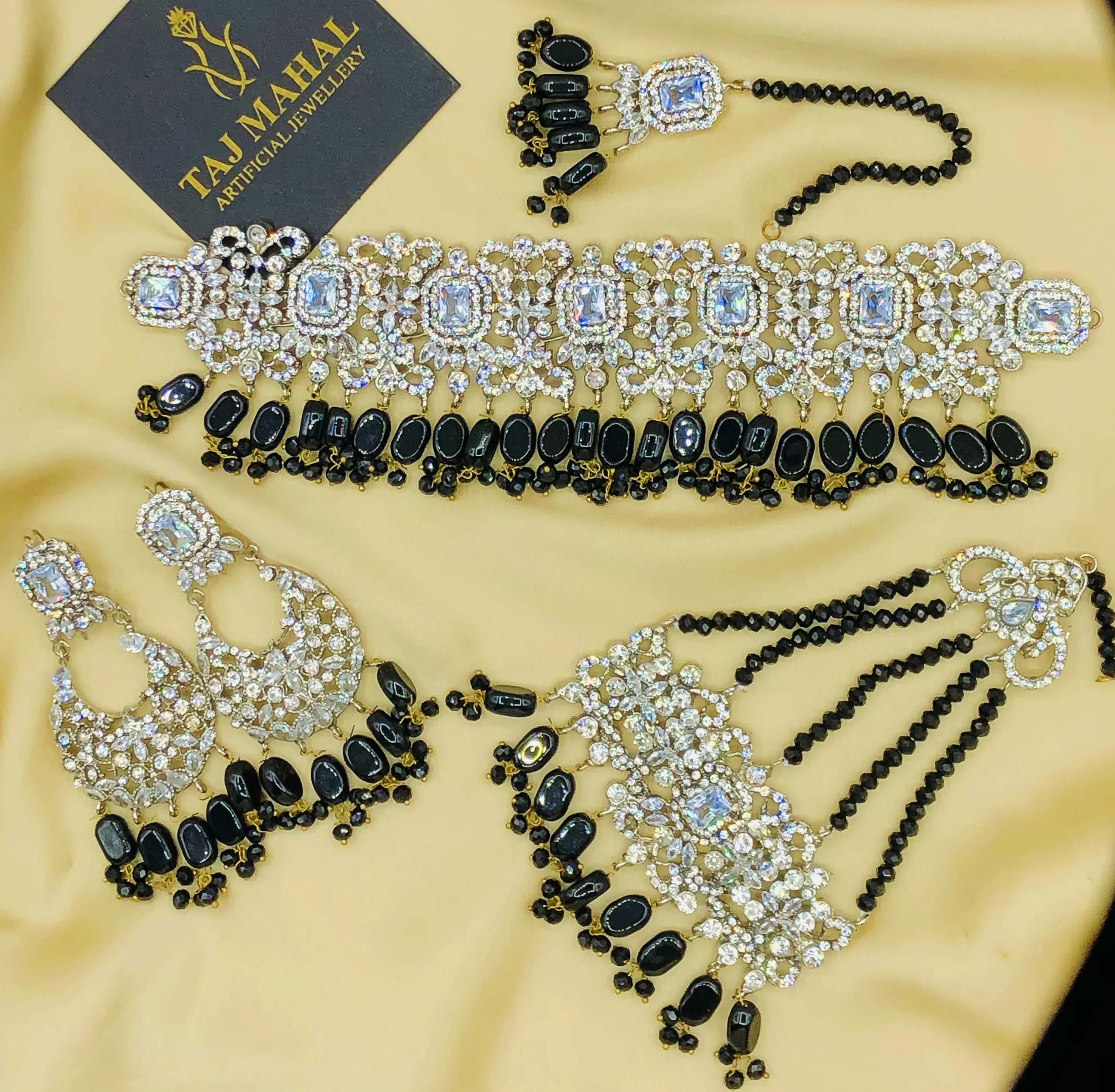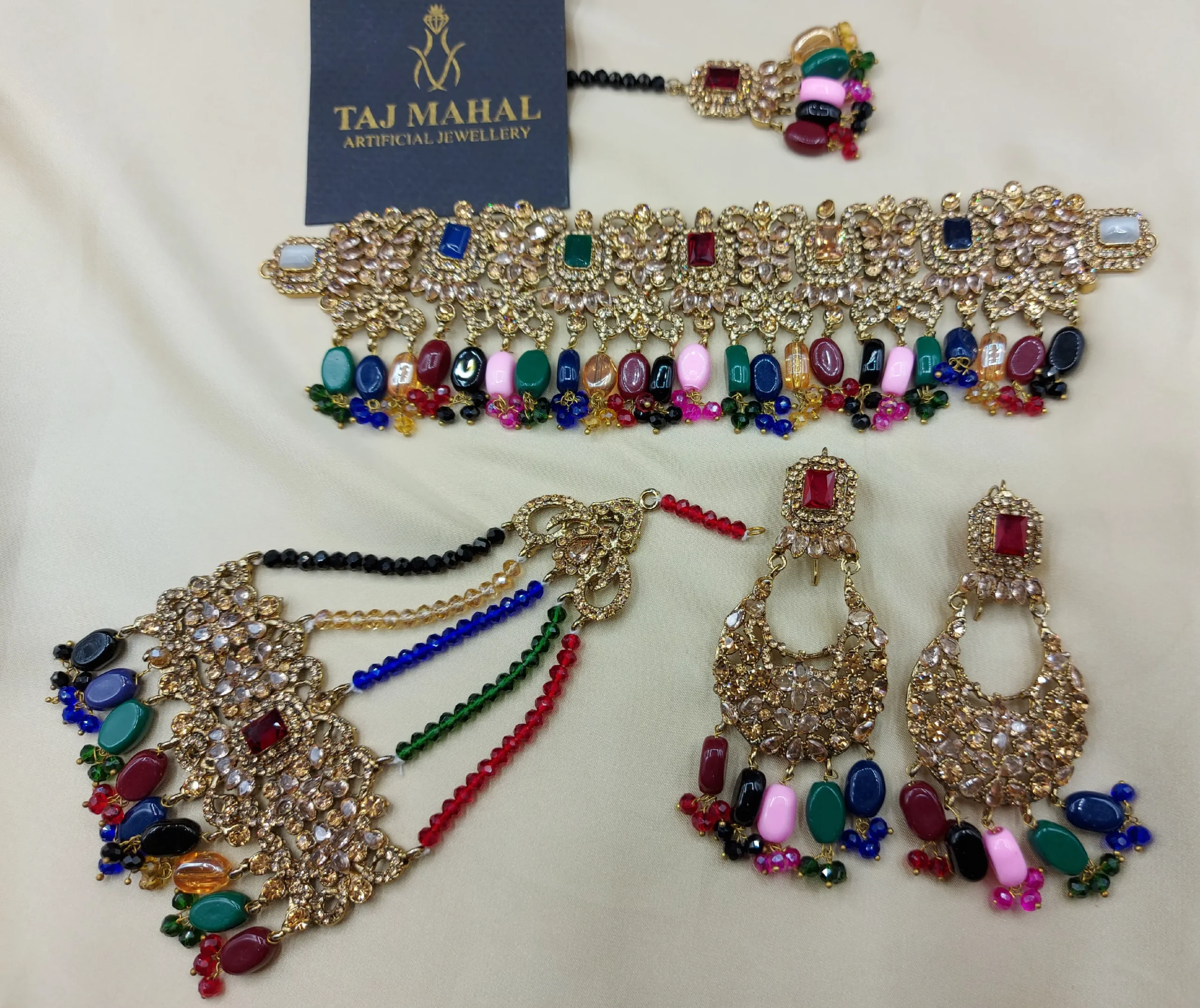 • Complete Combo: Isme heavy Choker, matching Chandbali Earrings, Maang Tikka, aur ek royal Jhumar (Passa) shamil hai.