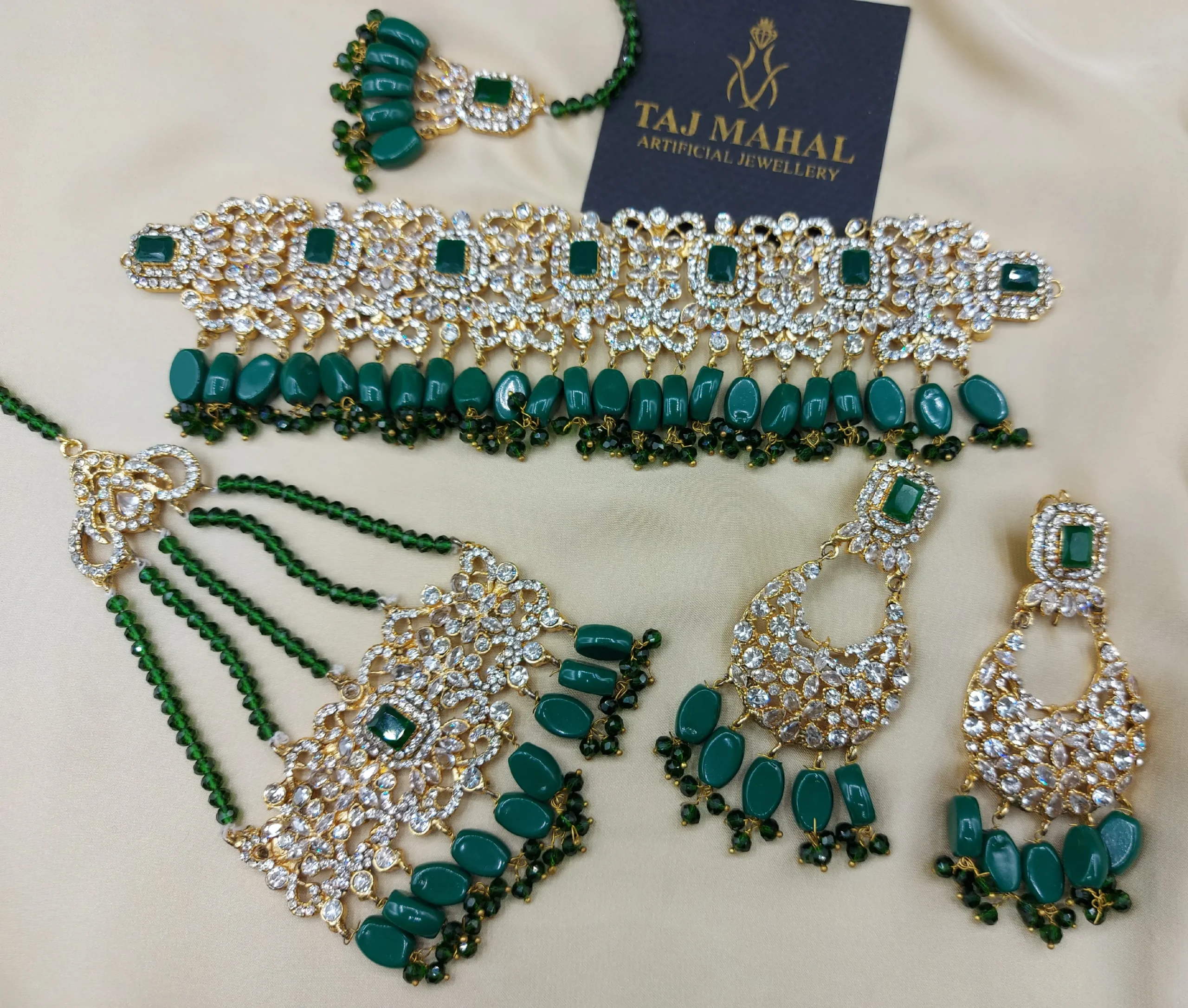 • Design: High-quality Zircon work aur center mein emerald-cut green stones ka behtareen istemal.