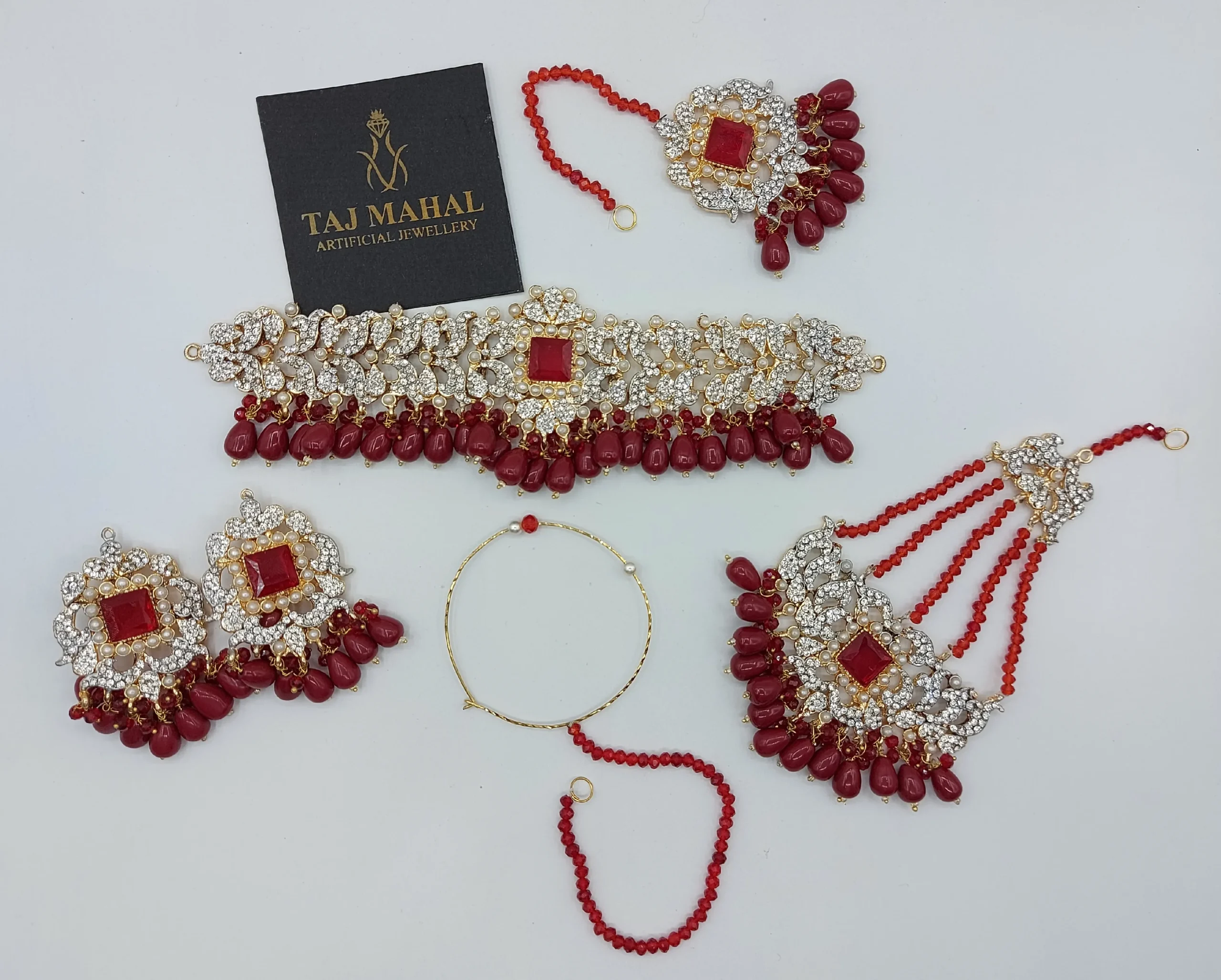 Full Bridal Combo: Isme Choker, Matching Earrings, Maang Tikka, Royal Jhumar (Passa), aur ek nafees Nath (Nose Ring) shamil hai.