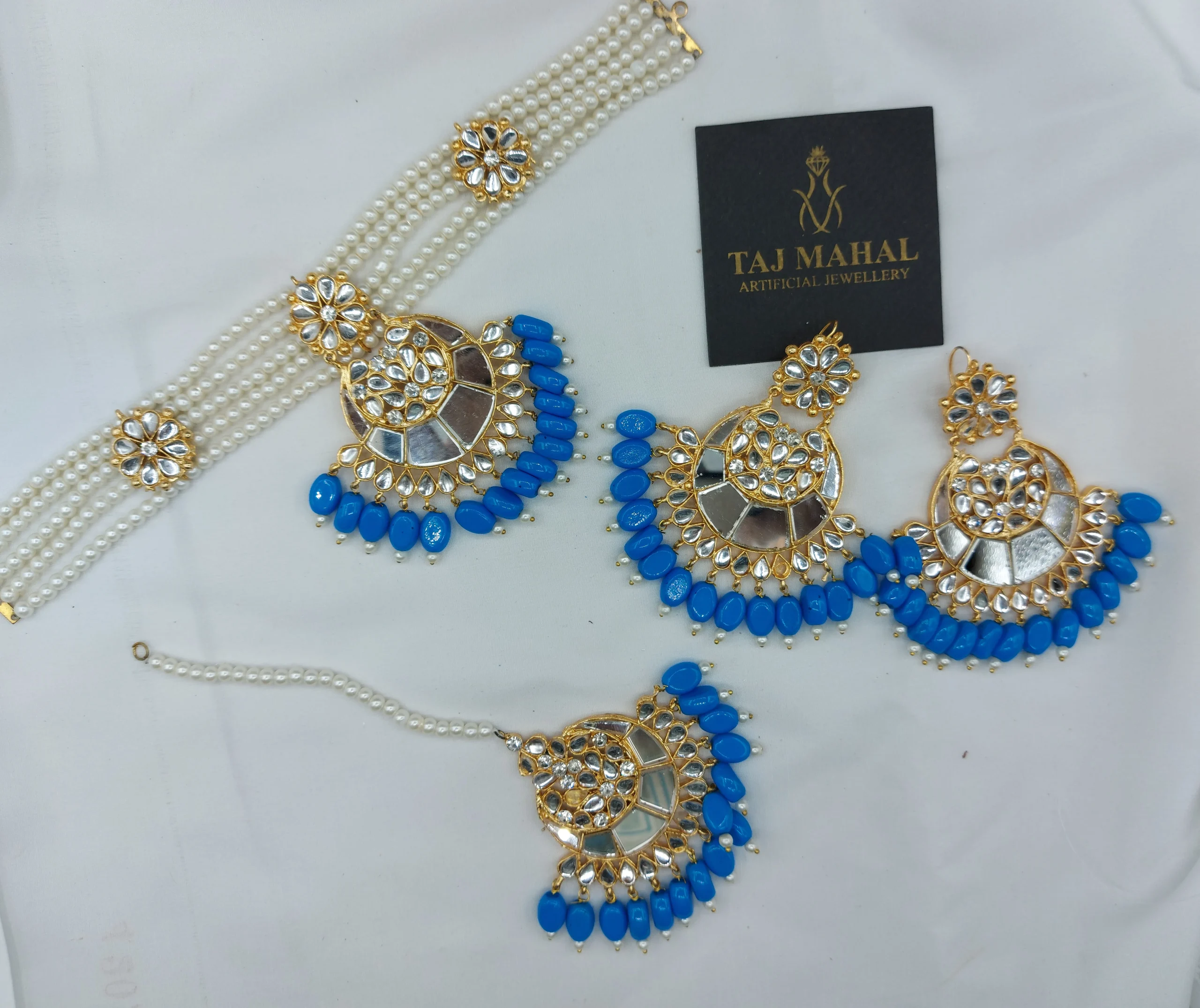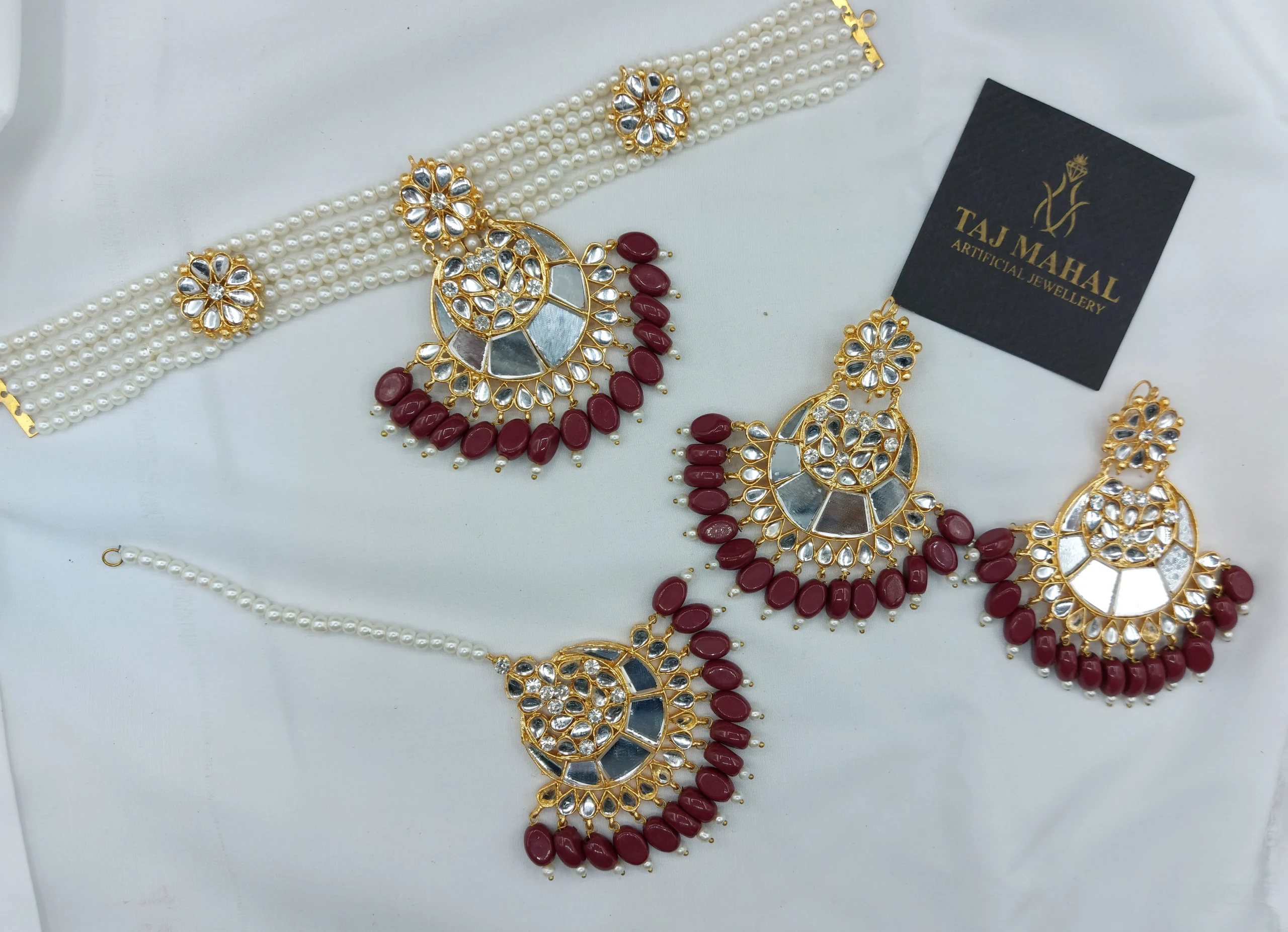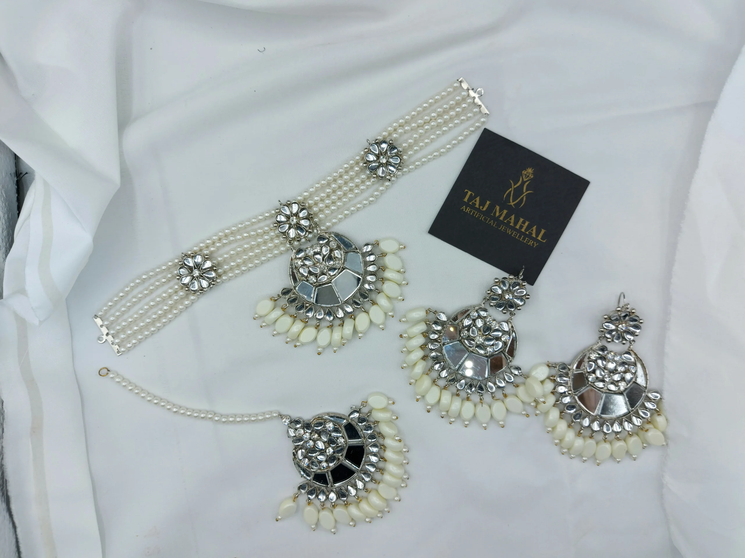 Elegant Mirror Work Pearl Choker Set – 3 Piece Necklace, Chandbali Earrings & Maang Tikka