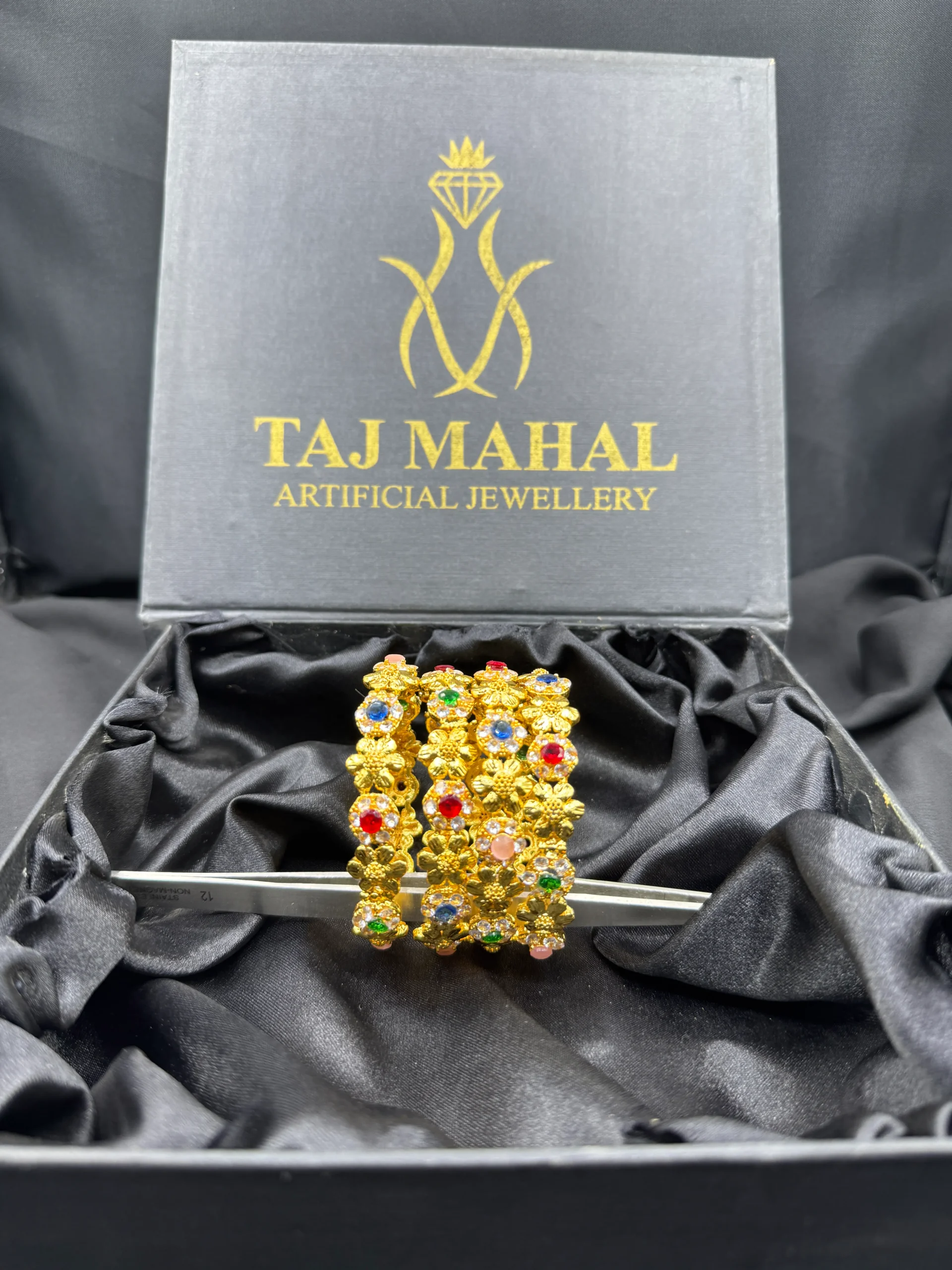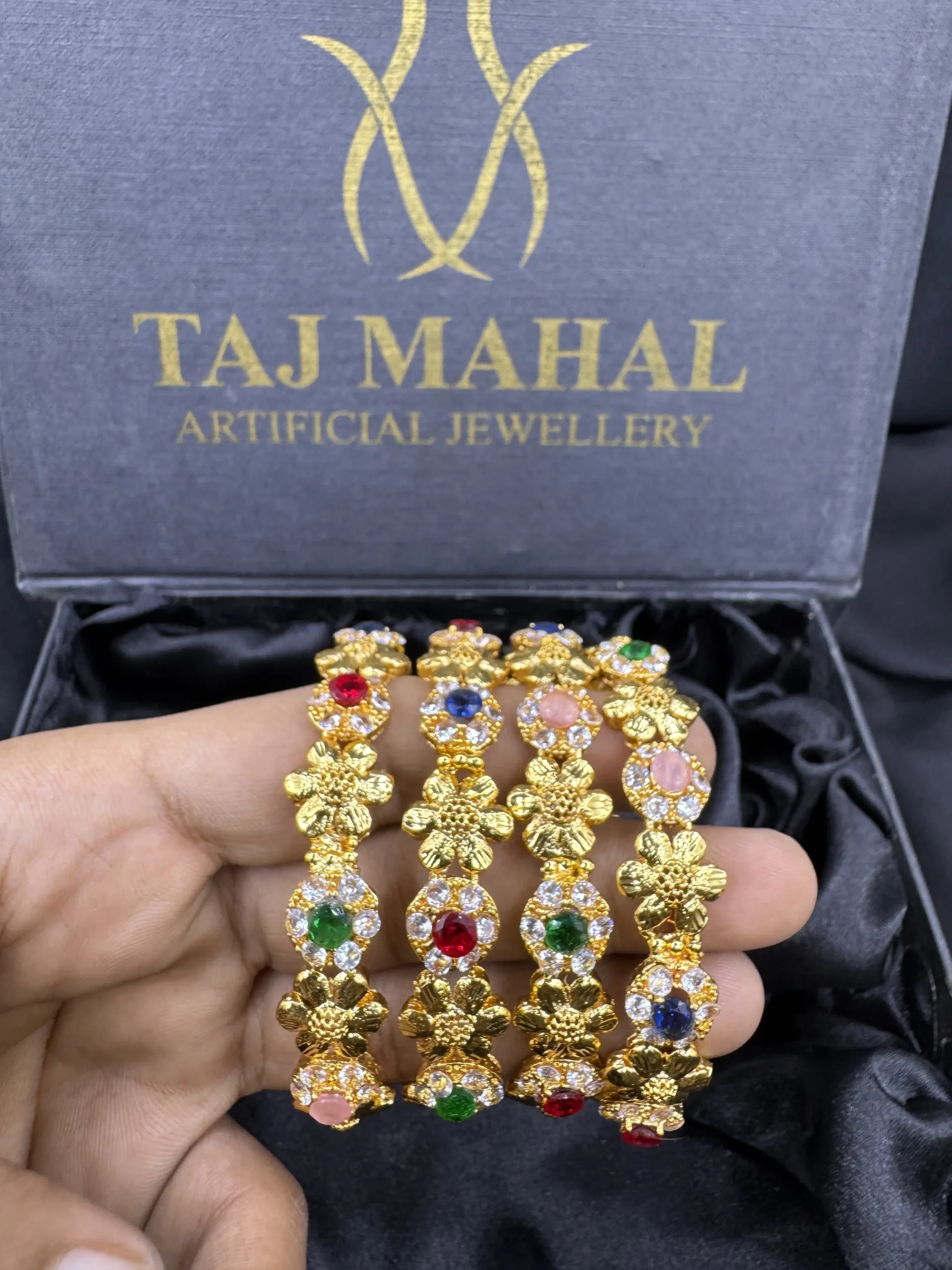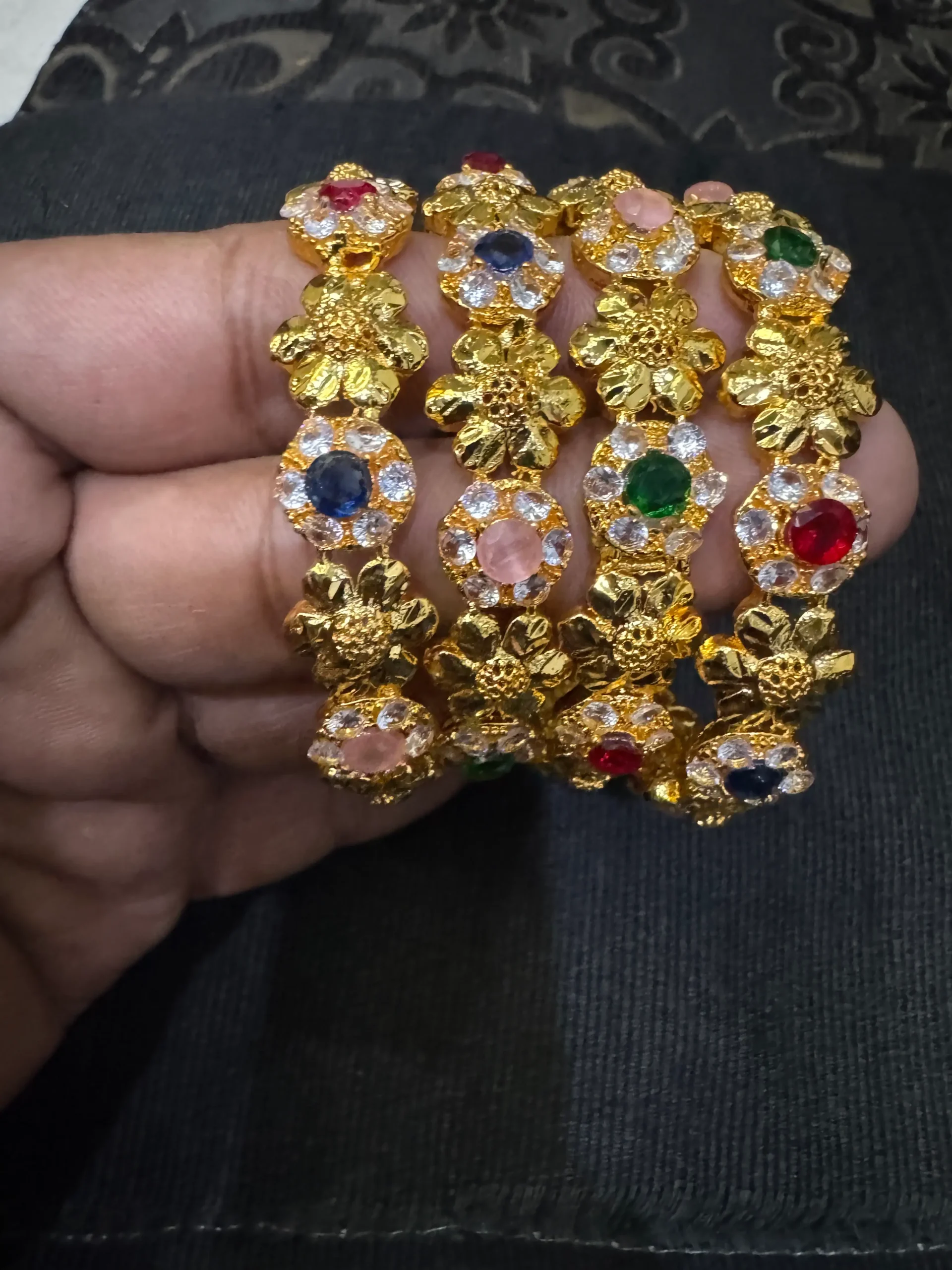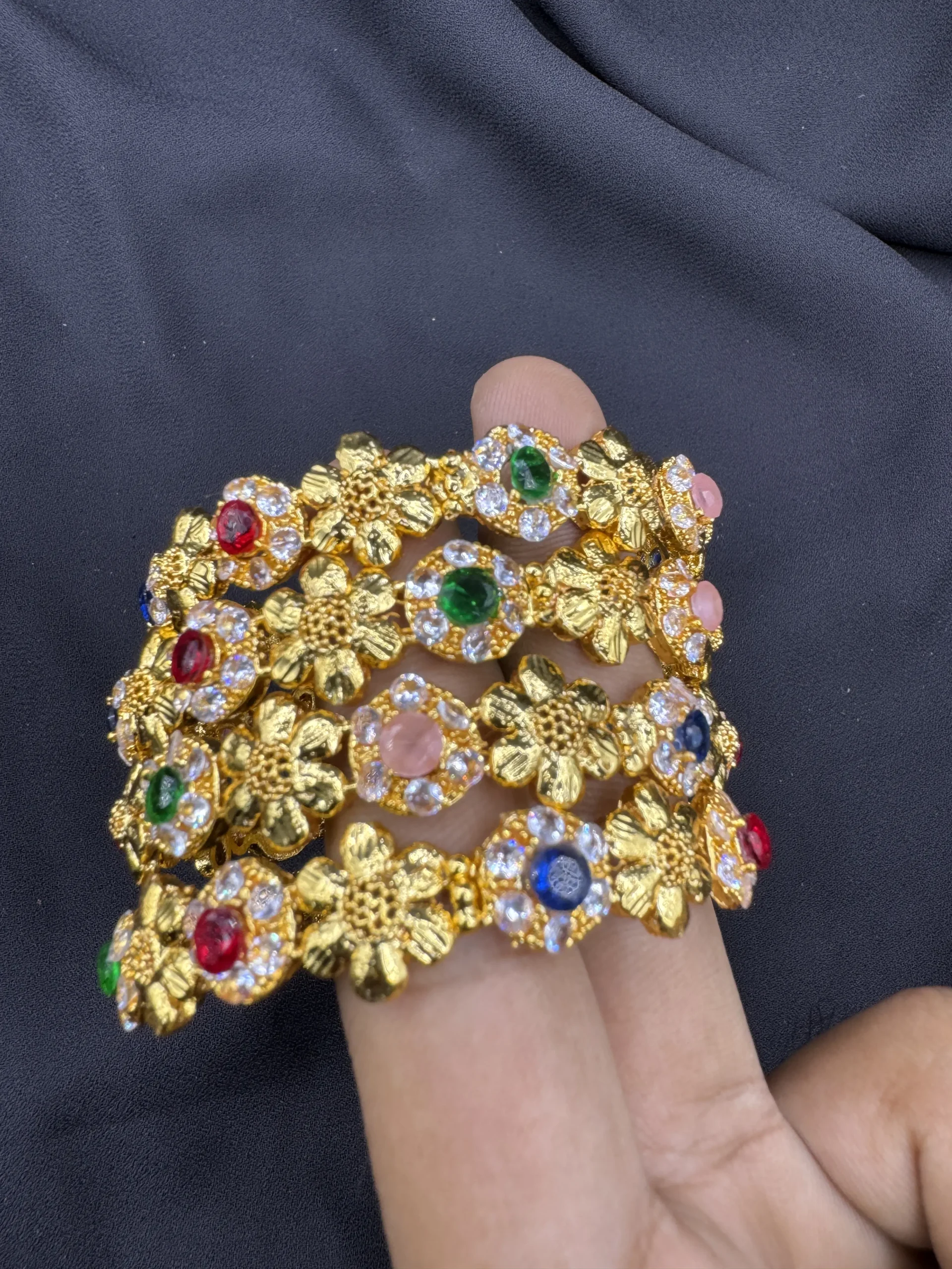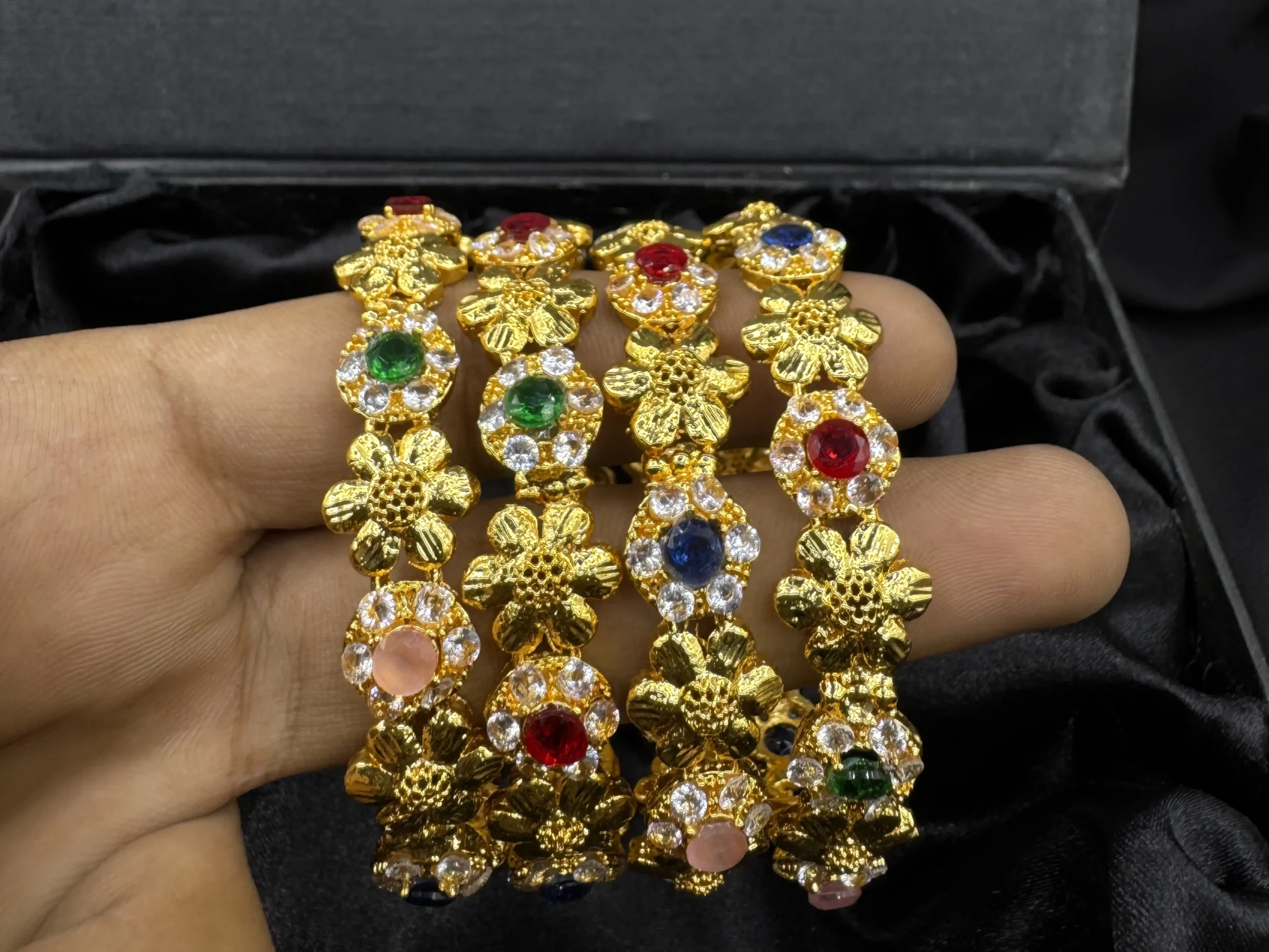 The craftsmanship is what really stands out; the stones are surrounded by tiny white crystals that give the whole set a high-end, ‘real jewelry’ look. They have a lovely weight to them without feeling bulky on the wrist. Whether you’re wearing a plain silk suit or a heavy embroidered lehenga, these bangles add that perfect pop of color and shine. They’re a true celebration of traditional floral design with a playful, modern twist.”