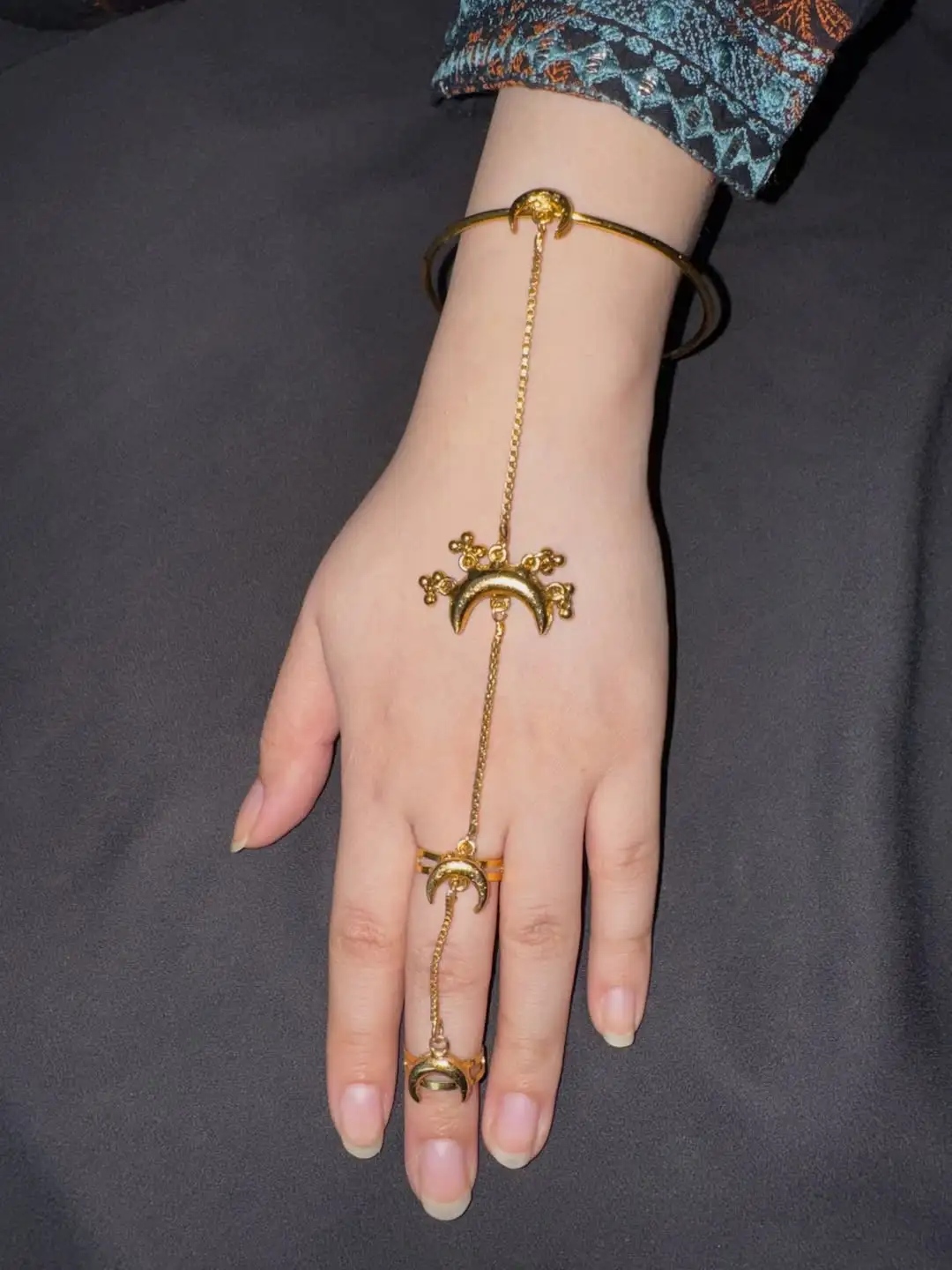 Design: Featuring four crescent moon motifs across the bangle, hand, and rings.